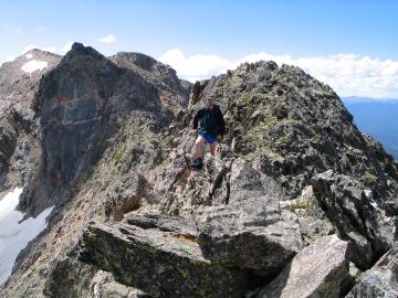 Following the faulty logic of the valiantly underprepared, we headed north around the lake and up the surprisingly steep slope of the northern end of the ridge. When we crested the ridge, we saw that, indeed, the western slope was considerably gentler than the eastern precipice as I had expected all along... for about a hundred feet! Soon we were scrambling among rocks on the top of the ridge in full four-limb-drive mode. We happened upon the people we'd seen from below headed back the other direction. "You can get about 50' farther before it gets impossible," they warned.
