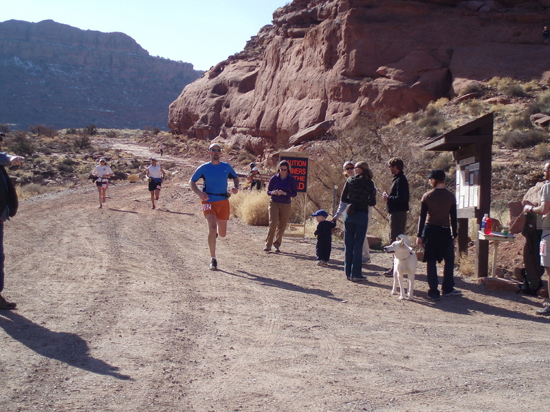 The first few miles of the Poison Spider trail were along a level dirt road with great views down the Colorado River. But my legs felt like wood and I was lurching around like a drunk. Keeping moving even on level ground was tough. After two miles of this, we reached a drop off and started a more technical descent. Somehow this was easier. Sure, it was hard to avoid the rocks and roots, but somehow the mental effort required helped propel the physical exertion. Non-runners were becoming more common which was nice because spectators are my favorite kind of taters. Dang, I must be tired...