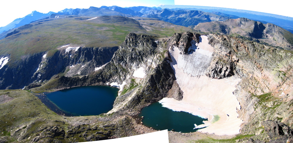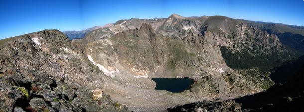There followed several wonderful hours of tundra-hopping picking my way along the precipitous edge of the Divide passing one embayment after another, each with stunning views of a pristine alpine lake or three, a gnarly tallus slope, the remnants of a snowfield, or some wild combination of all three. Each valley dropped gradually or quickly down below tree-line and merged with the huge wilderness of Forest Canyon. There were no aid stations, mile markers, or spectators. I was alone, at altitude, in full exploration mode and enjoying myself immensely. Sprague, Hayden Spire (at 5.6, a project for another day), "Mt. Eleanor", Pt. 12,497, Cracktop, Cheif Cheley...