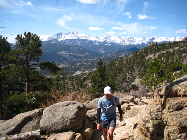 The weather was gorgeous and conditions looked good, so we decided to try to climb Mt. Chapin, the first of the Mummy Range peaks, at the very least. It was mostly free of snow and our eyes teared up a bit at the idea of some nice tundra running. We trotted up the lowly Marmot Point (11,900') and started the steep descent to Chapin Pass. But it was not to be. Our way was blocked by a mile of trees and, while the alpine tundra was mostly dry, the trees hid copious, hip-deep snow which was rapidly softening in the bright sun. So much for good karma! After half a mile of this, realizing we'd need to do at least another mile to get there and back, we decided we didn't want it that much after all and bailed out down to the road. At least we got a nice seven miles of fast downhill back to the car and it was very nice to see the mountains up close in an almost-summery condition (sort of).