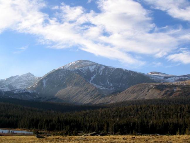 Our goal was Mount Audubon (13,224'), one of the higher and easier of the Indian Peaks. It's a very popular mountain for this reason and an easy trail winds up the vast eastern slopes to the summit. But we can't do anything the easy way! Our goal was the shorter, sturdier south east ridge, a 3rd class scramble along a mildly exposed ridge which separates the small eastern cirque from the rest of the Blue Lake drainage to the south. There had already been a sizable snowstorm even this early in the season, and the mountains had spotty snow cover.