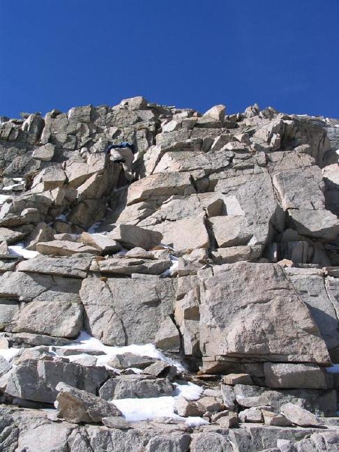 But the fun was not over yet! The climb out of the notch appeared to be straight forward up shelves and terraces of rock. However, they were a bit steeper than they appeared and presented some challenges. Fortunately, the broad cliff band provided many options and we threaded our way up about two thirds of it before running into a signficant band of snow. Nathan is not fond of snow climbing and performed various gyrations on steep rock to avoid it culminating in a very bold mantle onto the final slopes. I duplicated the bold mantle (very bold indeed), but there was no way anyone less than six feet tall was going to do it. Amy planned to traverse south along a sloping, snowy ledge and come up that way, but it looked like it had serious fall potential. Fortunately, I carry a short bit of climbing rope for just these occasions! She tied in and I bellayed her across the traverse. She came up smartly and never weighted the rope, but it gave her a welcome mental edge.