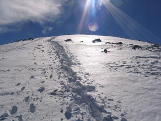 Amy starts the descent along the summit ridge. | Some of the deeper snow on the descent near the summit. |