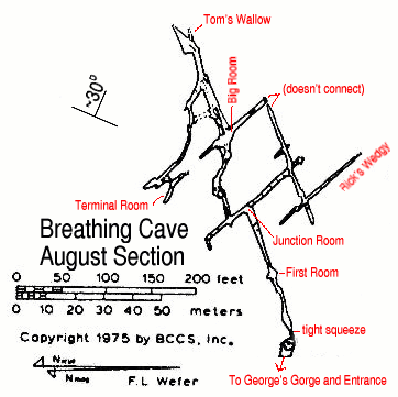 As sketcher, I brought up the rear while Rick set stations and did backsights. Tom, in the middle read the tape and did frontsights. When I wormed through the not-too-bad constriction into the August Section, I found them hard at work setting up the first shot. We were in a low passage perhaps three feet tall and five wide. The floor was packed dirt and sloped away before us. Perfect sketching conditions! Rick and Tom have no hang-ups about long shots; a couple 30'+ shots through similar passage brought us to the first room. I was rapidly filling the first page of sketching and having an easy time of it. In the first room, the ceiling rose to about seven feet and another passage intersected blocked with mud after about ten feet in each direction. Splay shots were performed while I caught up. Then it was back in low passage for another two shots until a similar but much larger room was reached. We paused for a while and had a quick first lunch.