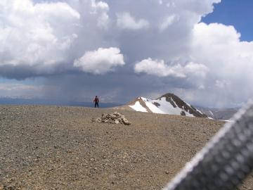 From here, it is a simple half-mile hike across similar desert/beach conditions to the double-peaked ridgeline summit of Lincoln. The weather had improved, but still threatened thunder. Furthermore, we'd gotten a later start than I liked and I was anxious to do our business and get down. The summit of Lincoln was definitely more satisfying than Cameron with a small rocky roost surrounded by views in all directions. Licoln is the 8th highest peak in Colorado and will likely remain my personal highpoint for at least a little while.