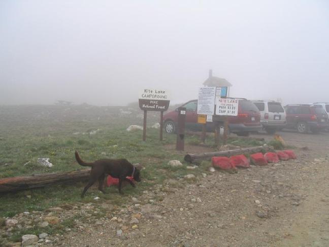 Justin and I met up at 4:30 in Boulder and headed south and west in a dense fog. By the time we'd reached the Divide, the fog had cleared and we we could see peaks in all directions. We drove past Breckenridge and the Quandary Peak Trailhead (spotting a black bear in the process), and crested Hoosier Pass. The weather south of the Divide was more reminiscent of our previous conditions. Dense fog shrouded everything and visibility was minimal at best. The Kite Lake Road is easily located from the center of Alma, and we drove up the valley on increasingly rough dirt road. By the time we broke above treeline (did I mention that this is a high trailhead?), the road was pitted with foot-deep holes and deep ditches. Justin persevered and we arrived at the trialhead at 7am.
