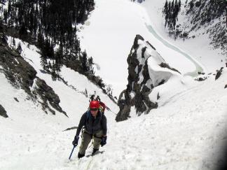 At Emerald Lake, we got a better look at the routes and saw that there were no technical difficulties in the bottom 2/3rds of the couloir. On the other side of the lake, the others were 'pointing up' at the base of the climb in the midst of a large pile of avalanche debris. It looked like several small slides had occured in the not-so-distant past. Still, the others, including the hyper-avalanche-concious Nelson, were going ahead with the climb. We skirted the lake on the south side and arrived at the staging area just as the others were a hundred meters up. From up close, I saw that the avalanche debris was at least a couple days old and had a thin layer of new snow on top of it. Looks good. All systems GO!