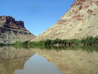 Returning to camp, we ate a leisurely breakfast of whatever was left in the coolers and packed the boats for the last time. The final 4.5 miles of river went too swiftly and soon we emerged into the Colorado at the Confluence. We'd heard various rumors that the Colorado was a lot faster and more turbulent than the Green and that we'd have to wear life jackets and stick close to the shore. In fact, the Colorado was smaller, slower, and calmer than the Green and appeared no less silt-laden. The walls here were impressively tall and the strata finally showed some variation from nearly horizontal.