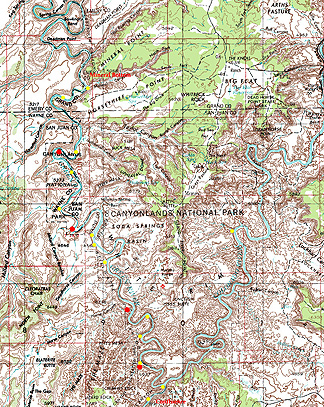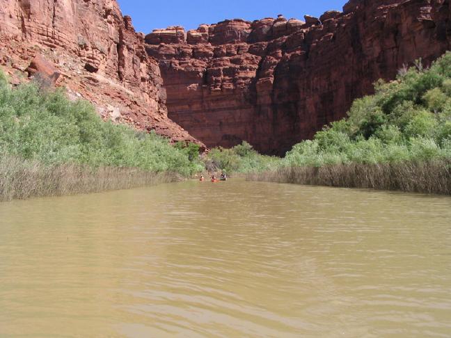 ![]() Canoing the joined Colorado and Green Rivers a mile below the Confluence. Our fears of strong currents and rough waters were unfounded. |