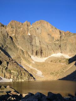 There's this thing on Longs Peak called the Keiners Route. It's shorter than the standard Keyhole tourist route and significantly more technical. Gerry Roach describes it as "possibly the premier mountaineering route in the entire state" with a spectacular approach and varied climb of snow and rock at about a 5.4 level. It starts with a 4 mile trudge on the well-groomed trail up to Chasm Lake, a sheltered lake at 11,600' nestled below the mind-boggling 2500' face of the Longs' sheer east face. From there, you skirt left across the Mills Glacier at the base of the east face and climb Lambs Slide, a steep couloir permanently filled with snow. From this scary position, things only get worse. Traverse across the middle of the face on the Broadway Ledge which is less than a foot wide in places before climbing a couple hundred feet of technical rock. Finish off with a bunch of 3rd-class scrambling up the edge of the famous Diamond and a final bit of 5.4 climbing to the summit. It's not too hard, but committing and potentially very serious. Once you get up Lamb's Slide, the fastest way off the route is to go up and over the summit.