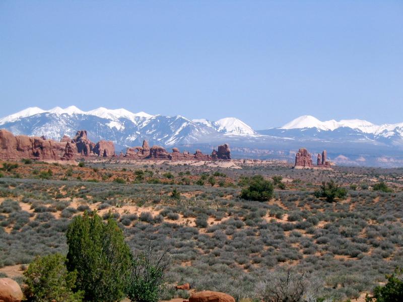 Fortunately, the weather soon mellowed and we saw the incredible scenery along the I-70 corridor. The familiar snow-tipped peaks of the Rocky Mountains gradually transitioned to flat-topped mesas and long hogbacks in the western part of the Colorado. The climate became drier and drier and, as we crossed the state border, transitioned in to wind-swept aridness. Far to the south spectacular snow-tipped peaks reared above sunset-reddened sandstone canyon country. By sunset we'd turned south on US191 toward Moab and watched the bluffs of the Moab Fault pass by. By dusk, we reached the town, found our way to Sand Flats Road, and ascended various twists and turns to the campsite as per Kristie's directions. They had secured a comfortable, sandy campsite in one of the public areas sandwitched between slickrock outcroppings and juniper bushes. The smell of sage brush and sand greated us as we set up the tent and marvelled at the desert sky overhead.