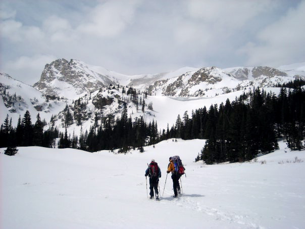 Peter, Ben and I headed out on a gorgeous-but-windy day at the Brainard Lake winter trailhead. We were heavily laden with gear, but not as heavily as we could have been since we weren't carrying either technical gear or tents as I have on previous winter trips. The plan was to head in to Lake Isabelle--one of the most gorgeous spots on Earth--and set up a snow cave. After a cozy and convivial night, we'd climb something on Sunday depending on conditions... or at least that was the plan.