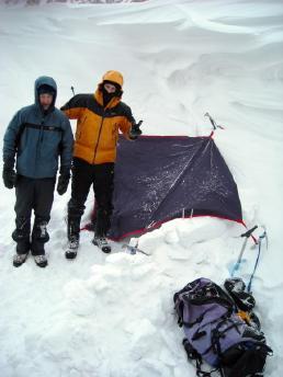 Ideal snow cave design has a nice platform for sleeping with a domed roof, ventilation holes, and a nicely wind-proof entrance and vestibule/cooking area. However, by 6pm, after four hours of digging, we had a barely-adequate cave about 6' wide, 6' long at it's longest, and perhaps 2' high at most. Ben and Peter rigged a tarp over the front to keep the wind to a minimum. Cooking was hurried and unsatisfying as we shivered in the wind, so we wolfed down some food, then crawled into our cave. The three of us could squeeze in there as long as our feet overlapped on the end and we didn't mind a close view of the ceiling. We passed a few jovial minutes remarking on the ridiculousness of our situation and how we had underestimated a lot. Despite our best efforts, snow had gotten into everything and I spent a very chilly hour or two despite the fact that the cave was pretty warm. The tarp failed to block the wind and Peter, with his head closest to the door, was hit with blasts of spindrift every few minutes. We slept fitfully for the first half of the night, realizing that we were stuck for the better part of twelve hours.
